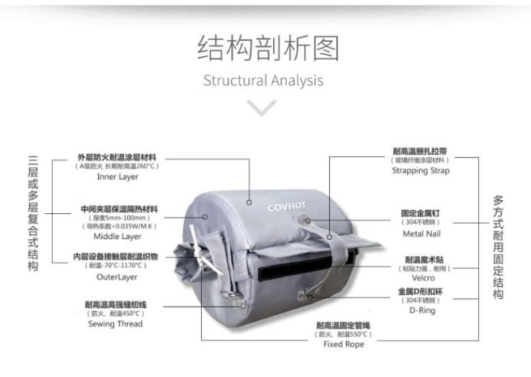 可拆卸保溫套(衣)是一種新型的設備保溫產品,對高溫設備和低溫設備都有保溫隔熱的作用。安裝簡單、拆卸方便,且不影響設備的正常使用。不僅防止能量的不必要損失,而且還會隔斷設備溫度,操作人員可以用手直接接觸。