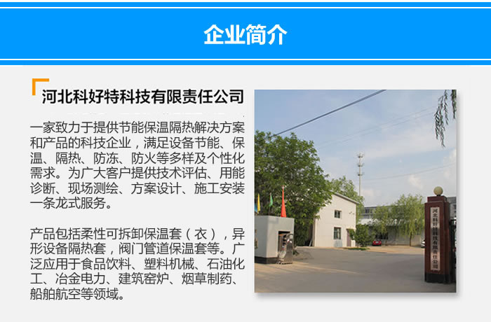 如果您有設備保溫隔熱需求,可以聯系科好特covhot的工程師,告知我們設備的圖片、圖紙及其使用環境,我們根據您提供的圖紙精心設計,或者提供現場測繪服務,然后加工制作而成。柔性可拆卸式設備保溫隔熱罩綜合經濟效益好,是目前工業節能環保的理想產品。也歡迎廣大代理加盟商與我們聯系合作!