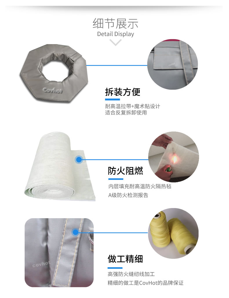 柔性可拆卸式設備保溫隔熱罩采用耐高低溫防火保溫材料;由內襯、中間保溫隔熱層、外保護層三層組成,能快捷的安裝或拆卸,可以貼合不規則形狀的設備、管道,且保溫效果好、拆卸使用方便。