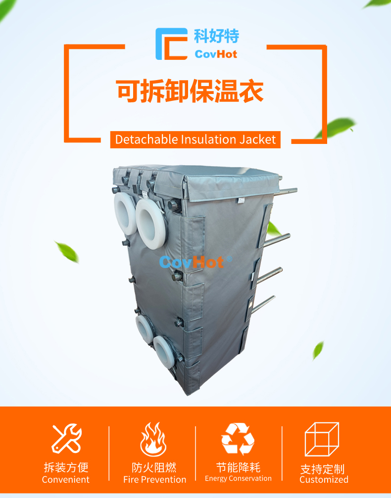 針對以上的問題,科好特自主研發(fā)的節(jié)能型板換保溫套,根據(jù)設(shè)備不同的尺寸形狀量身定制,可有效減少換熱器的熱損失,裝拆方便,可重復(fù)使用。節(jié)能型板換保溫套是工業(yè)節(jié)能保溫理想選擇!