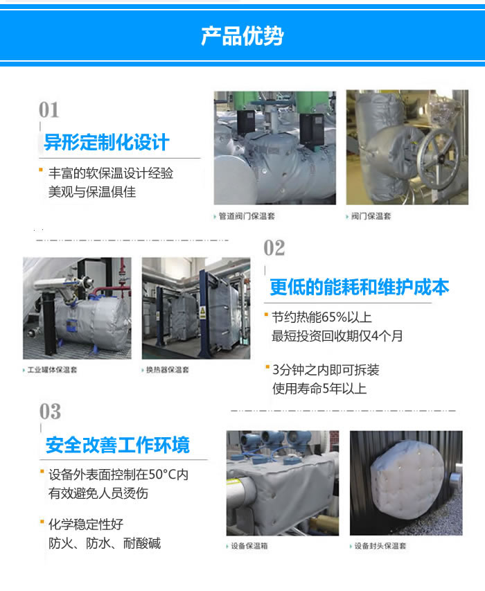 5、厚度:根據(jù)不同設(shè)備,一般15-50mm,溫度高時(shí)可用多層保溫被。